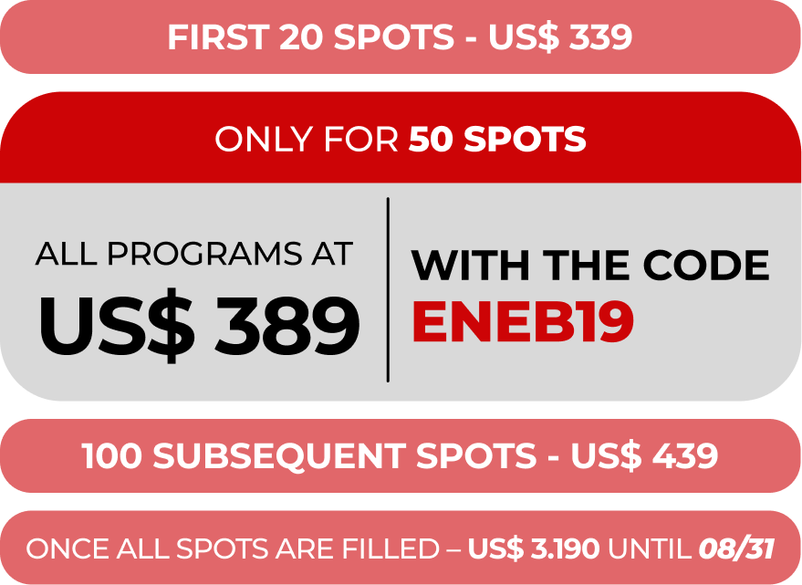 The 19th Promotion will be the first to enjoy all these advantages. Use the code ENEB19 to join and enroll in any of our programs for US$ 389. Only for the first 50 enrolled! After that, we’ll release 100 spots at US$ 439, and once they’re gone, the price will rise to US$ 3.190!